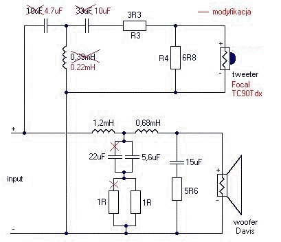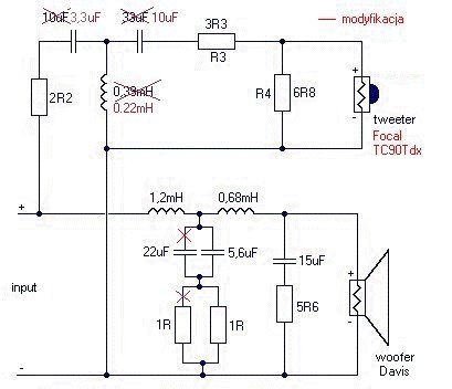 - w sekcji niskotonowej odłączyłem kondensator 22uF i rezystor 1R/5W.